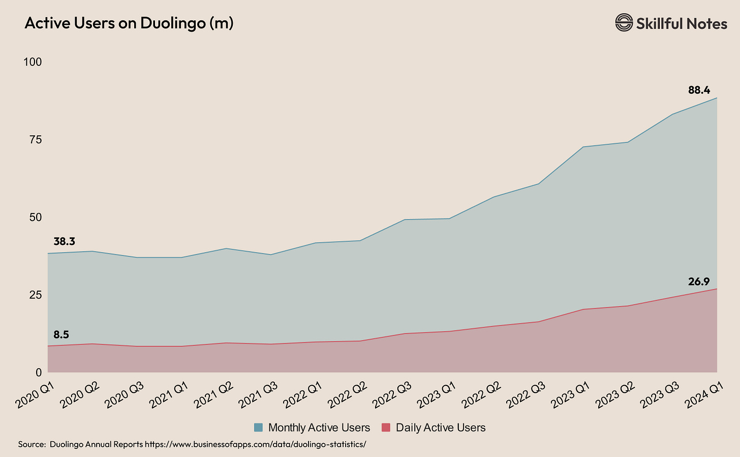 The core of Duolingo's appeal is that it takes the gamification of language learning to the highest possible level. Badges, levels, points, reminders, and social aspects combine to create a hyper-compelling experience. A multitude of memes attest to the almost-painful feeling that comes with breaking a learning streak, and Duolingo appears to be getting even better at this: in the last four years, the ratio of daily active users to monthly active users has grown from 22 percent to 30 percent.